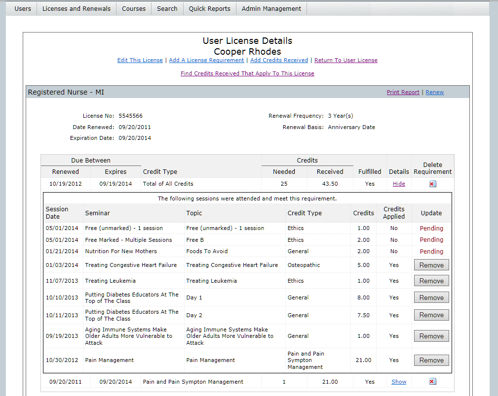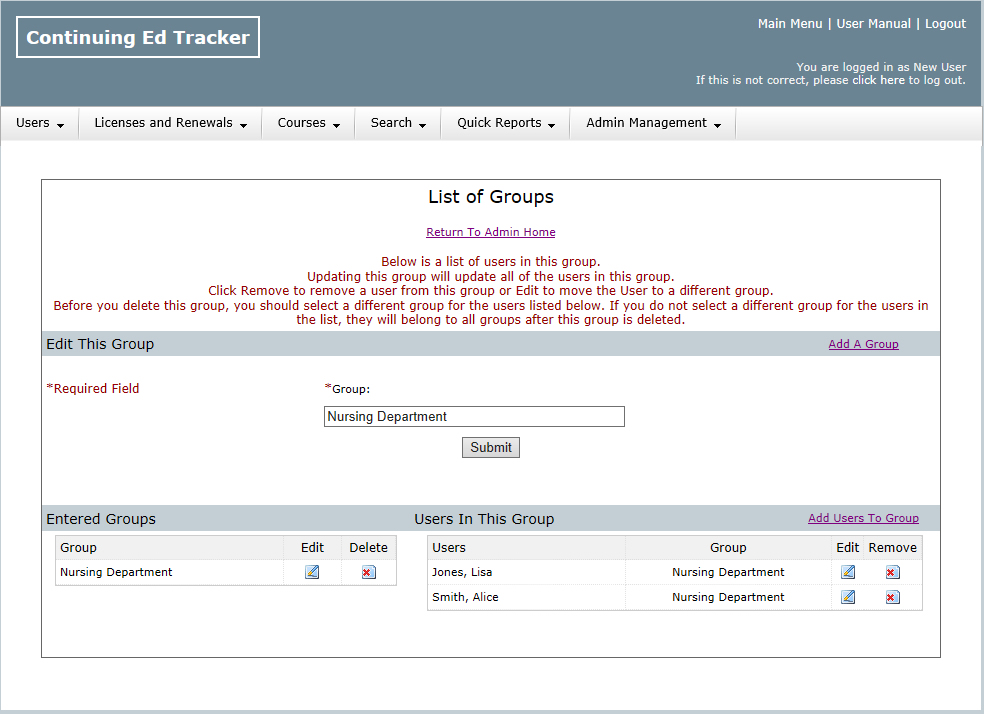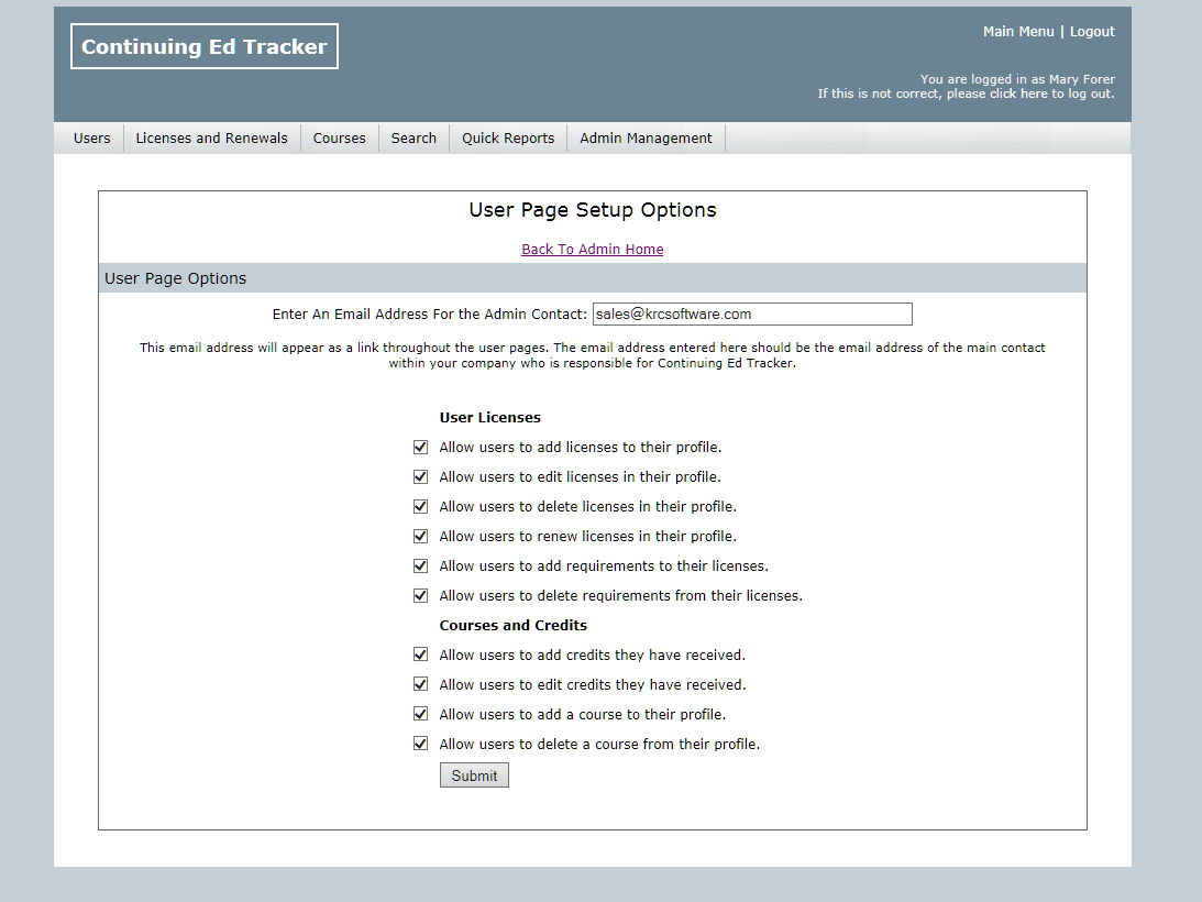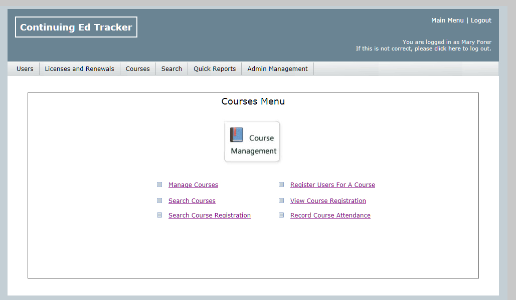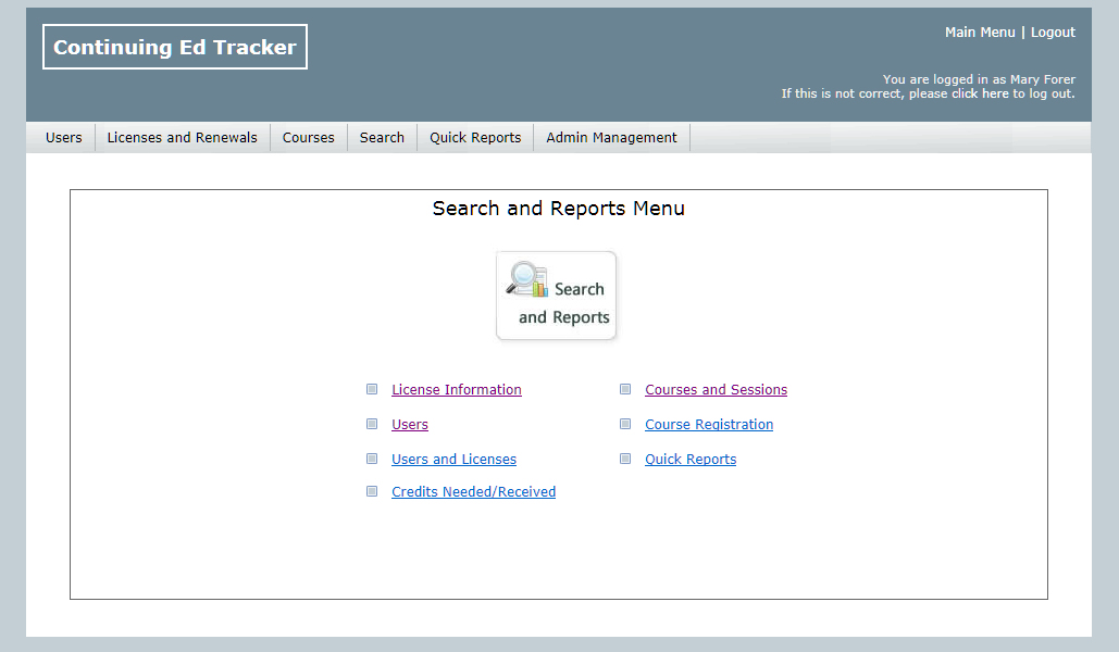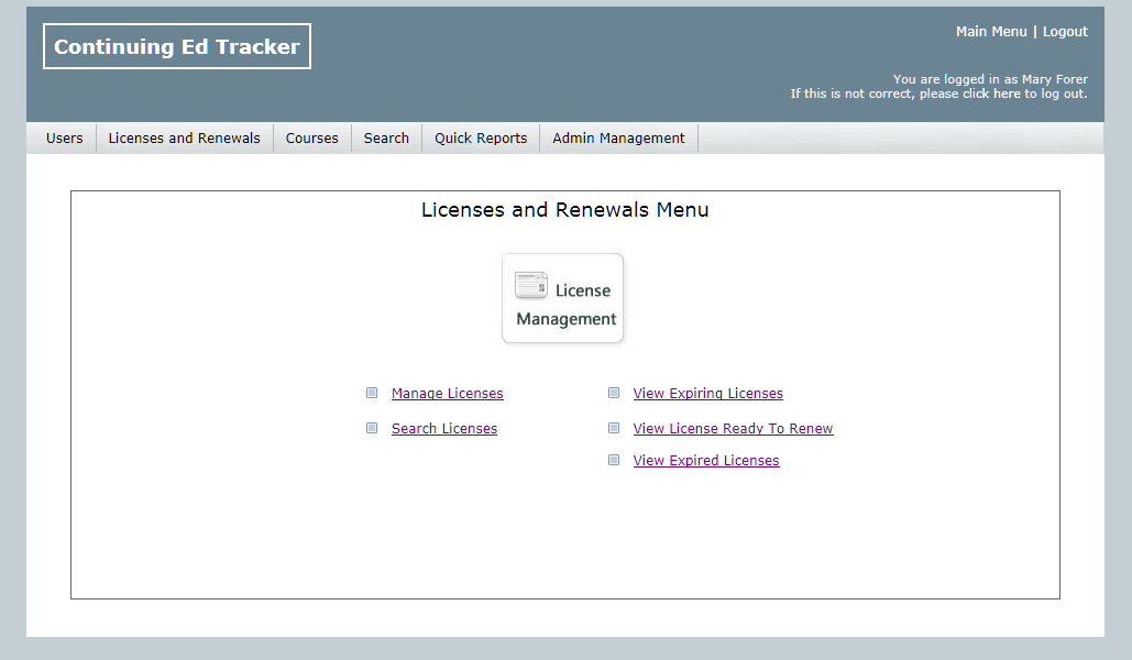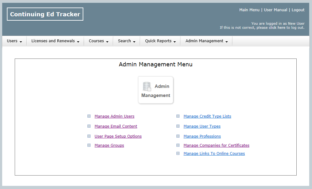 Links to the various features of Continuing Ed Tracker LIVE are also provided so administrators can quickly perform needed tasks.