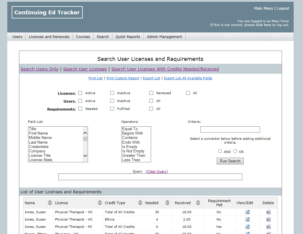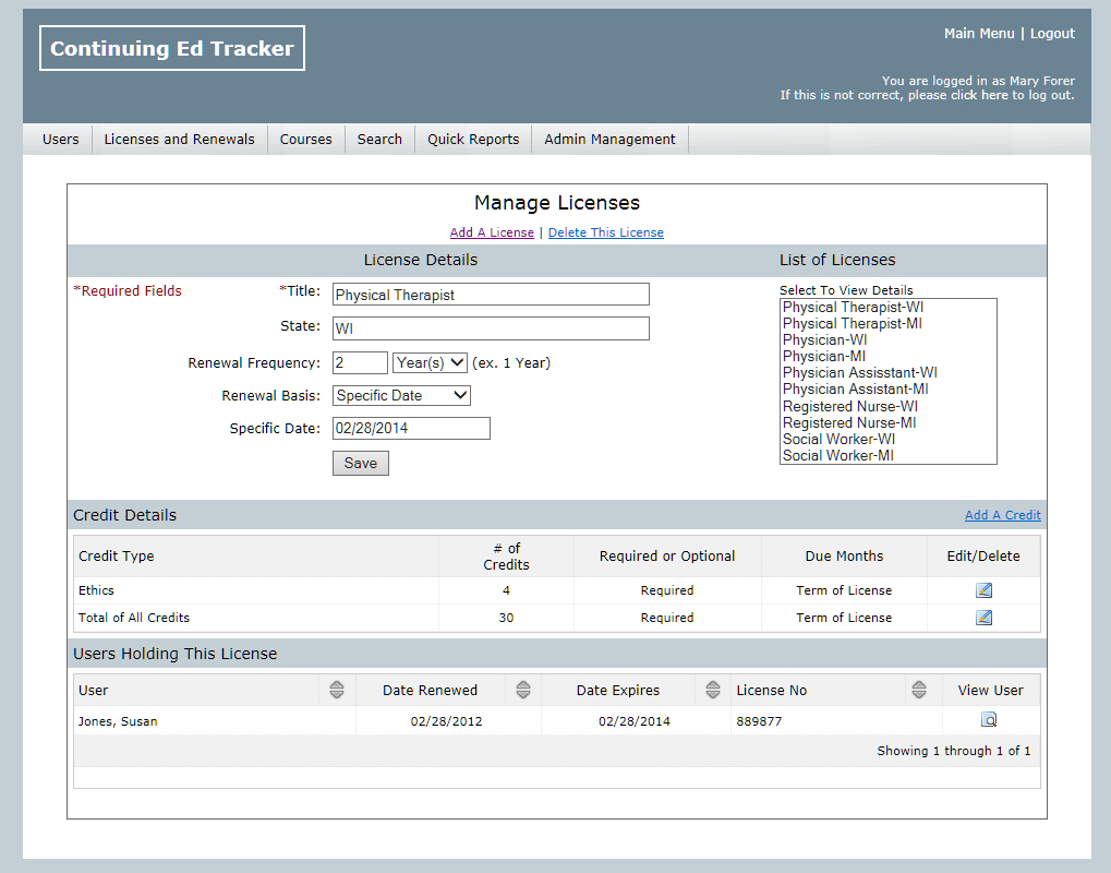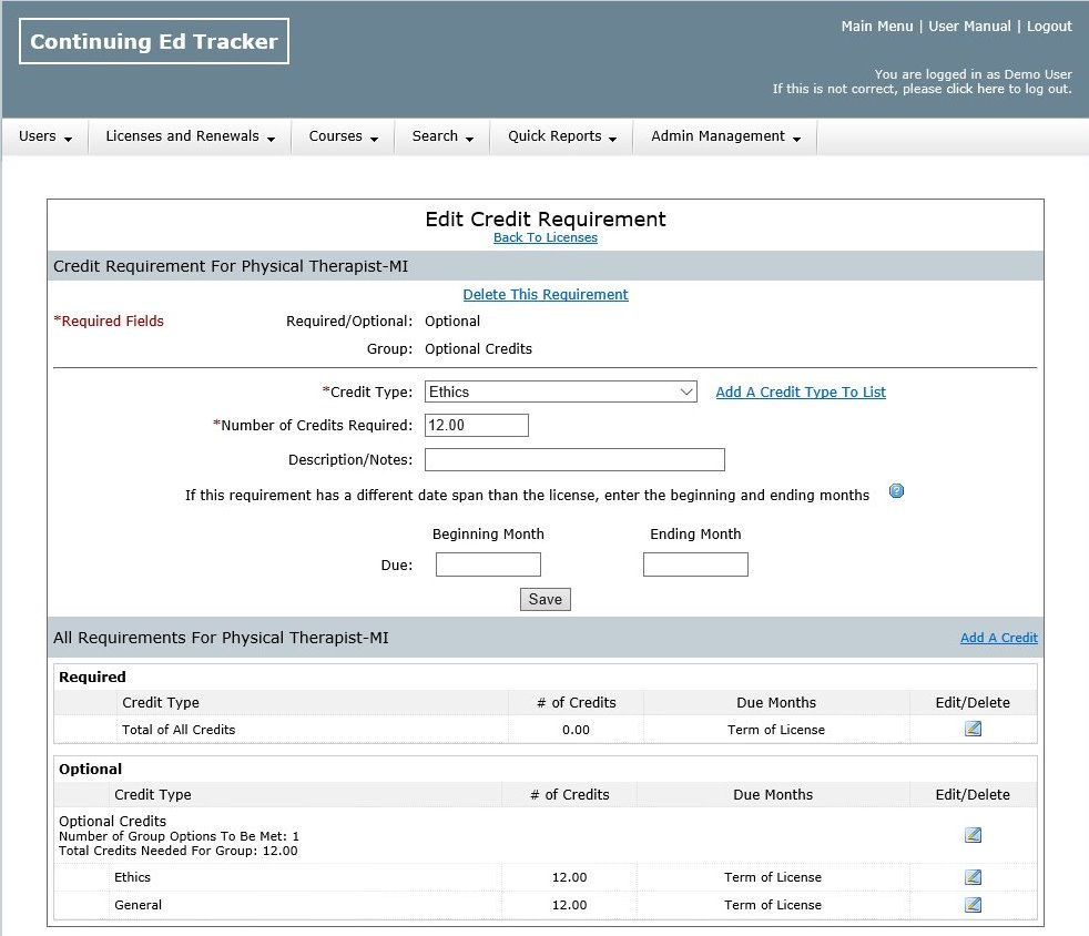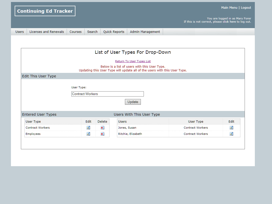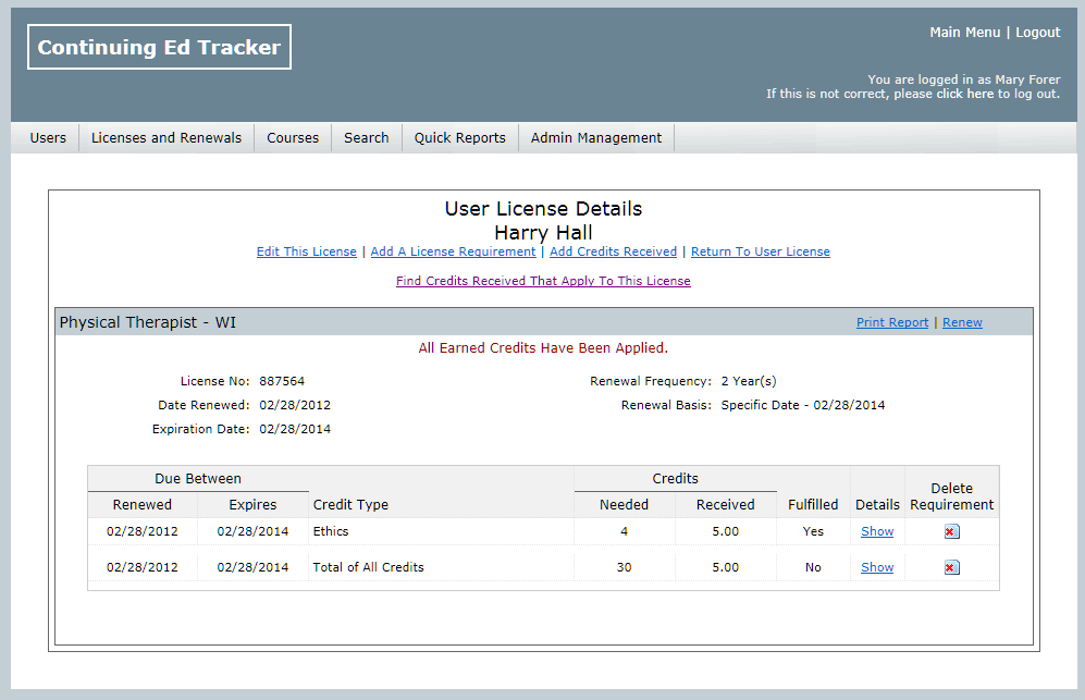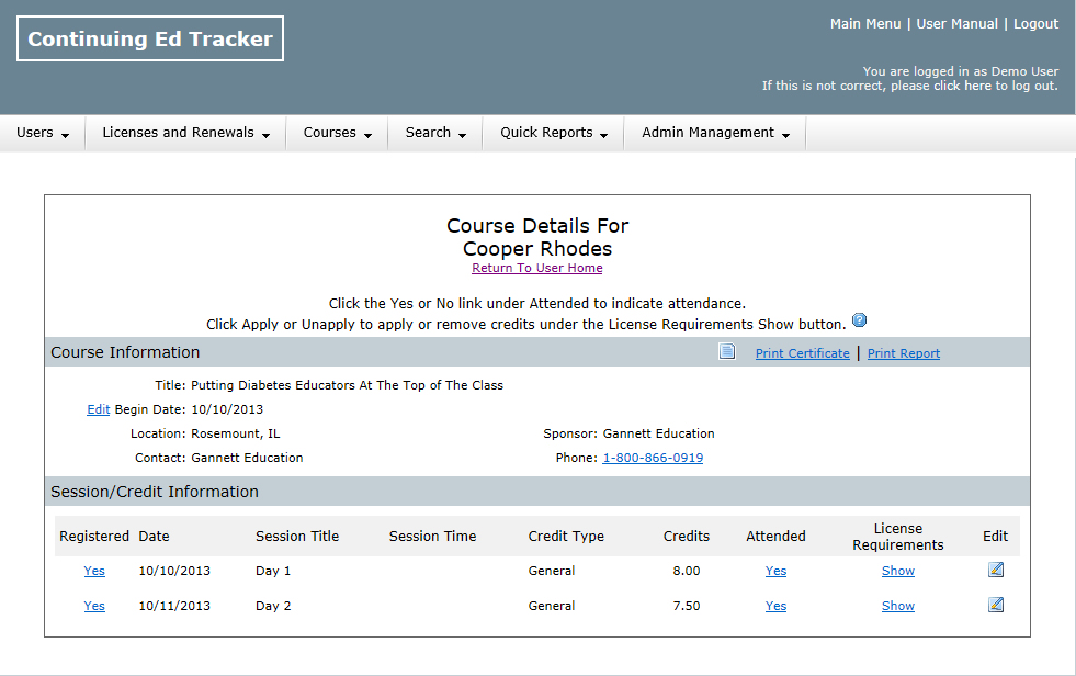 Links to the various features of Continuing Ed Tracker LIVE are also provided so administrators can quickly perform needed tasks.