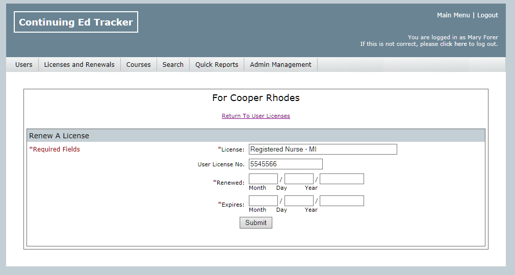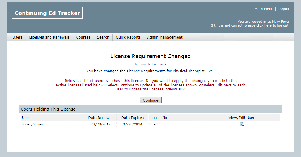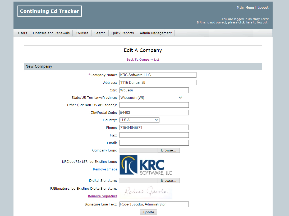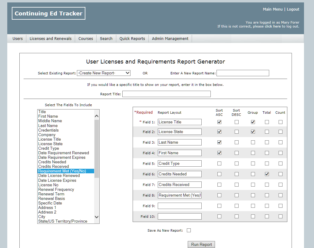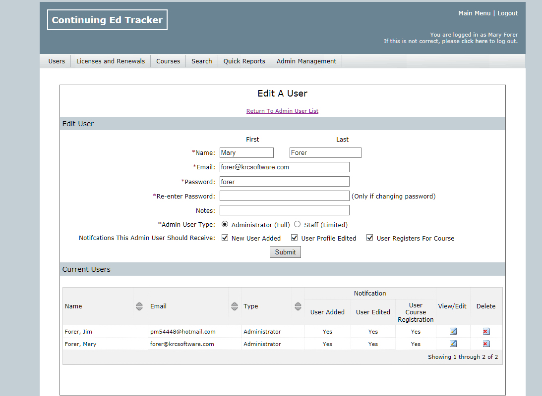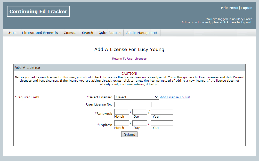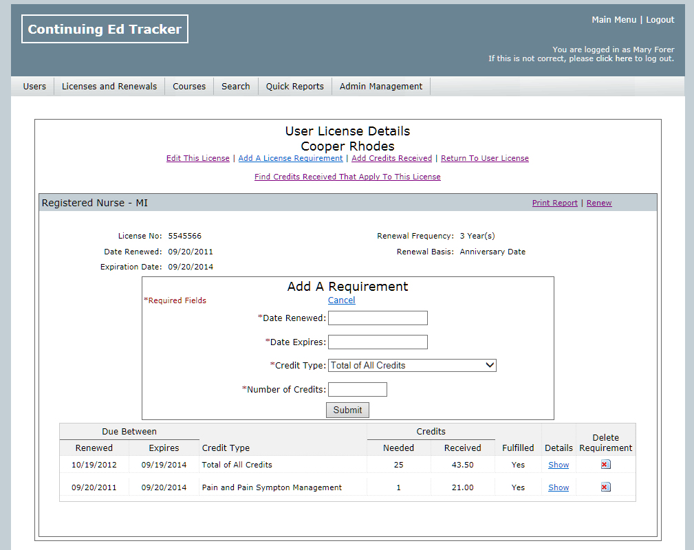 Links to the various features of Continuing Ed Tracker LIVE are also provided so administrators can quickly perform needed tasks.