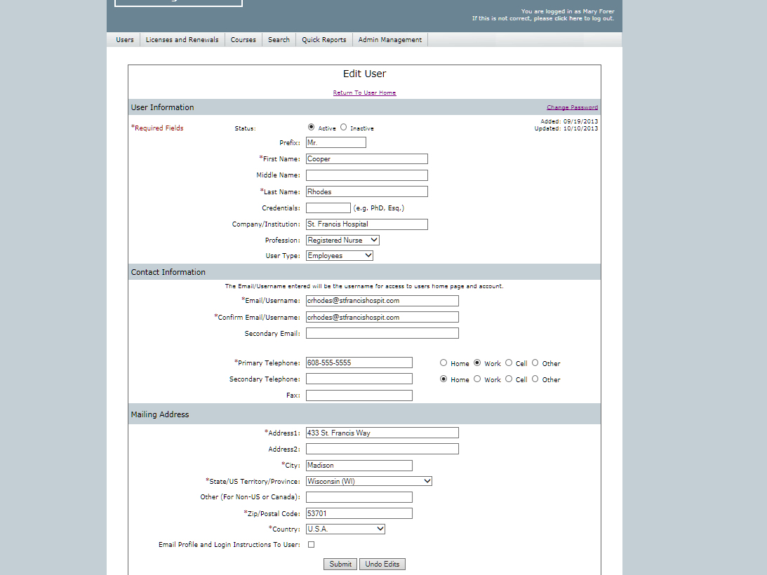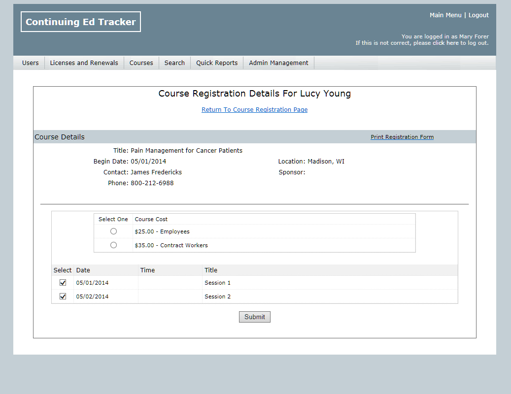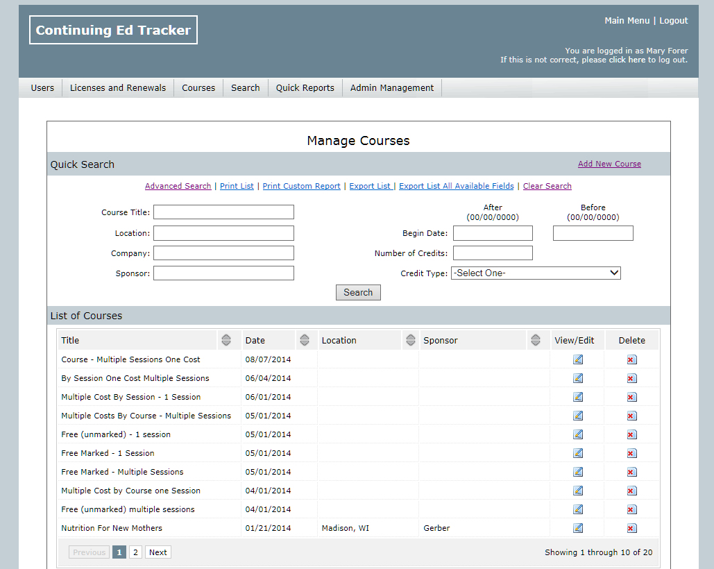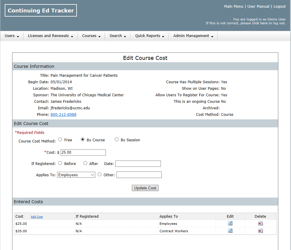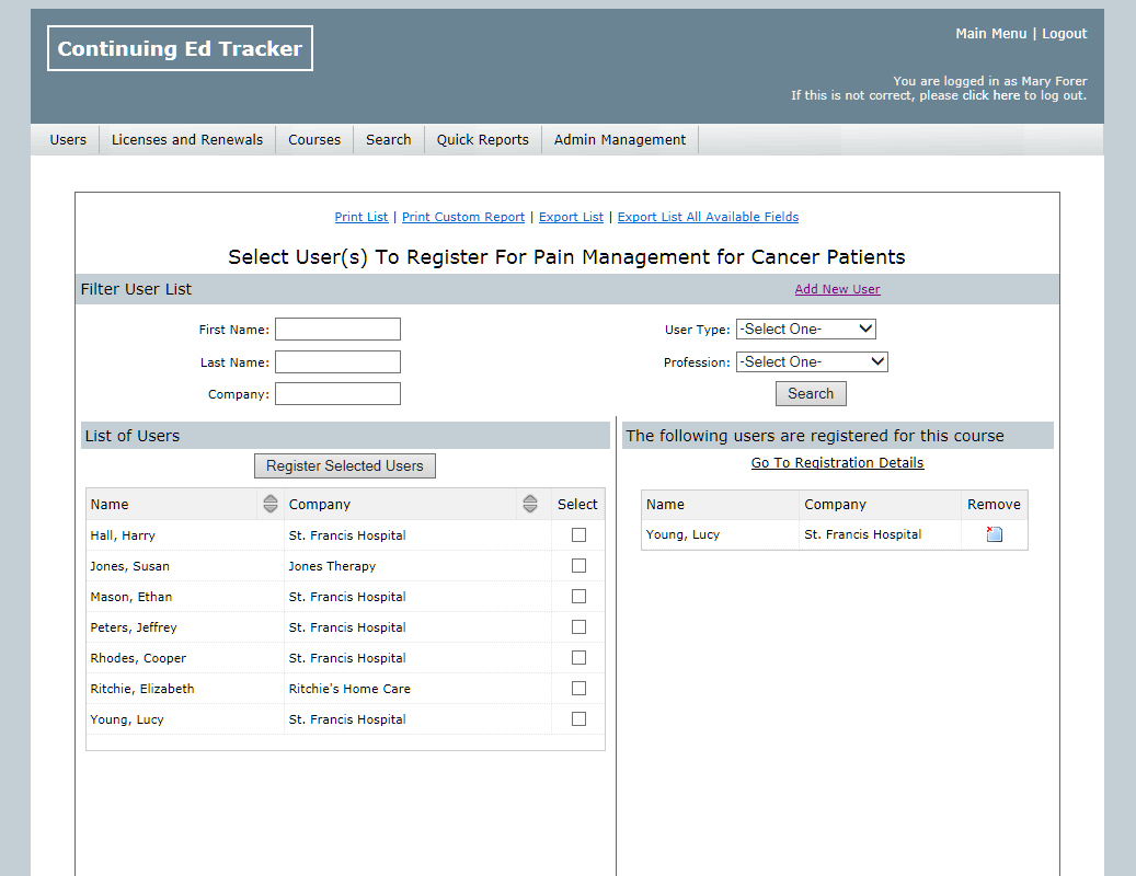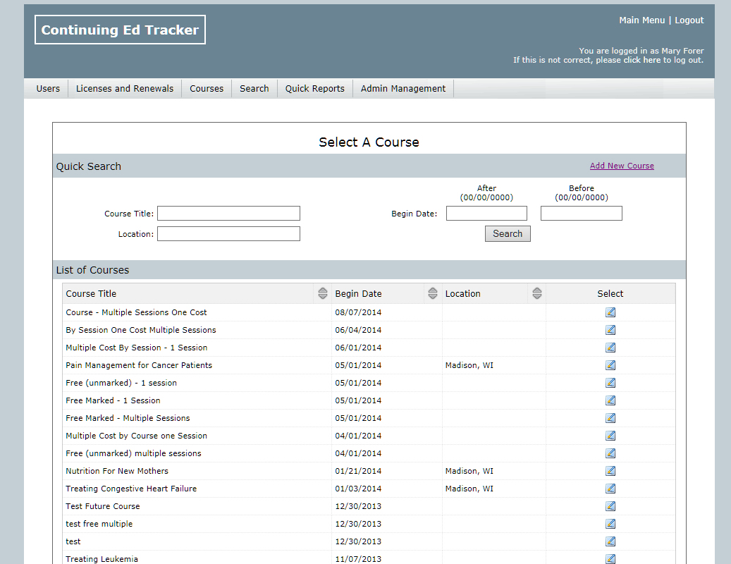 Links to the various features of Continuing Ed Tracker LIVE are also provided so administrators can quickly perform needed tasks.
