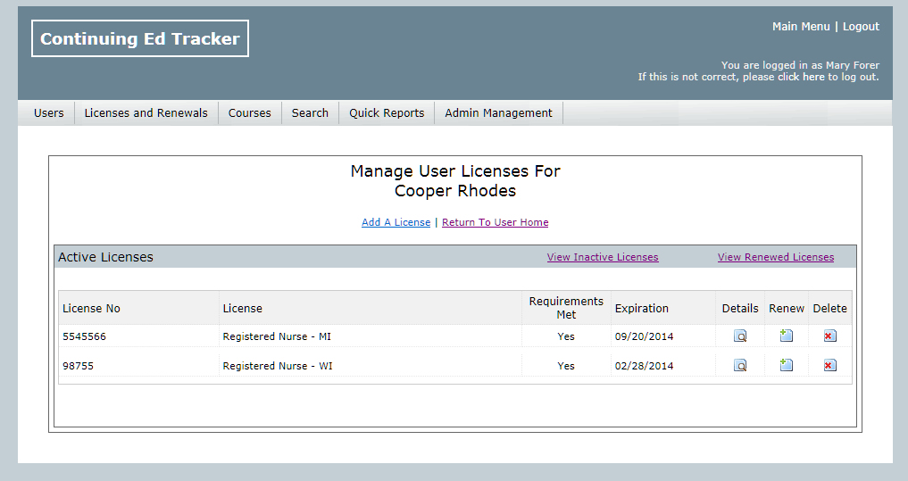 At the Main Menu, administrators are notified if any user licenses have expired or are due to expire. Administrators can click the Open link to view more detail about the user licenses in each list, or jump directly to a specific user license by clicking View next to the user in the list.