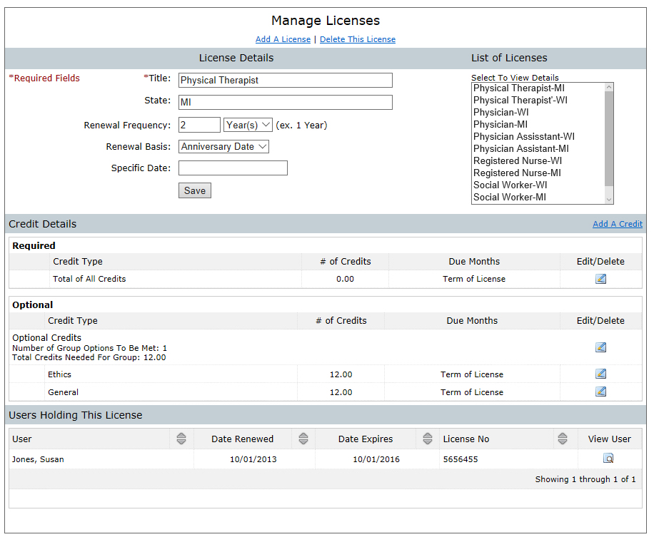 Open the User Profile screen to quickly view license status, course attendance, credits earned and contact infomation all in one convenient place. Quick links allow you to add or edit user licenses, course attendance and contact information in just one simple click.