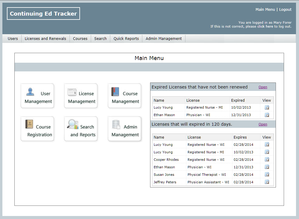 The Main Menu notifies you of licenses that have expired or are about to expire. Open the list to quickly view who has or has not met their licenses requirements. Email links on the user profile allows you to quickly contact your people with their license status.