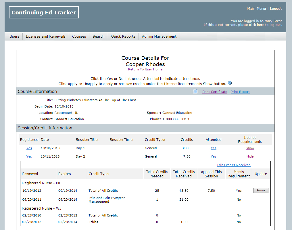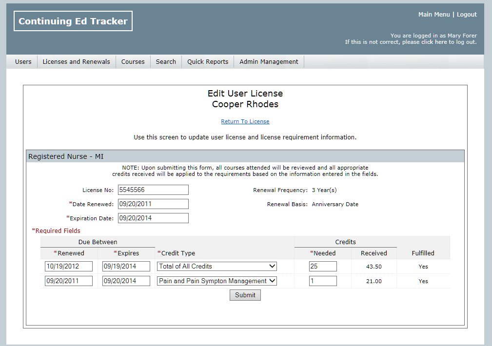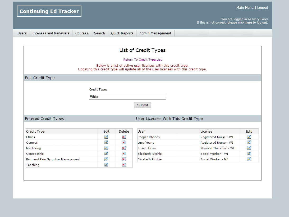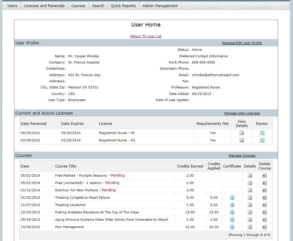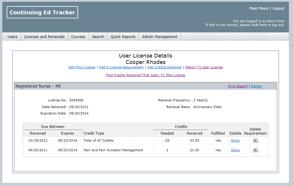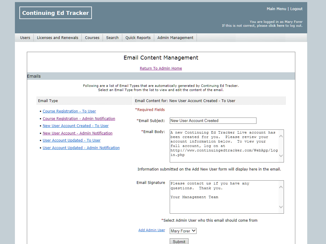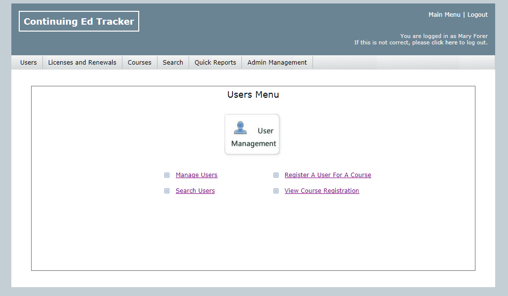 Links to the various features of Continuing Ed Tracker LIVE are also provided so administrators can quickly perform needed tasks.