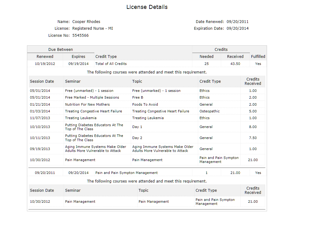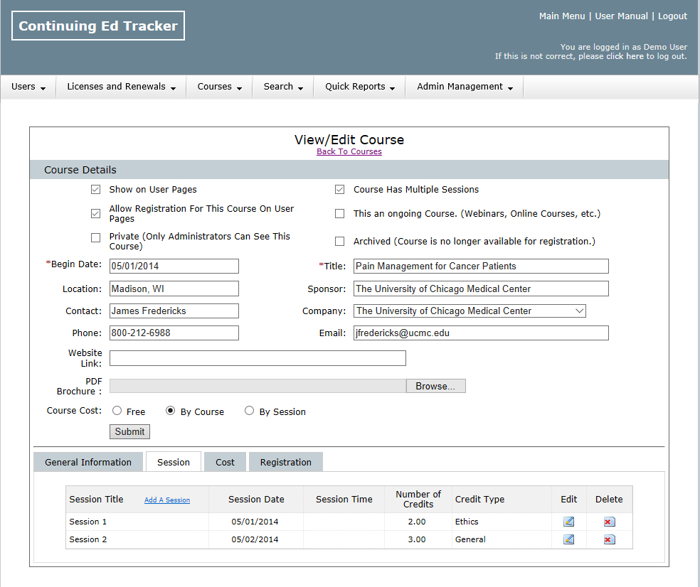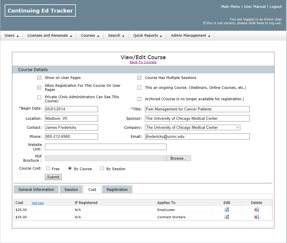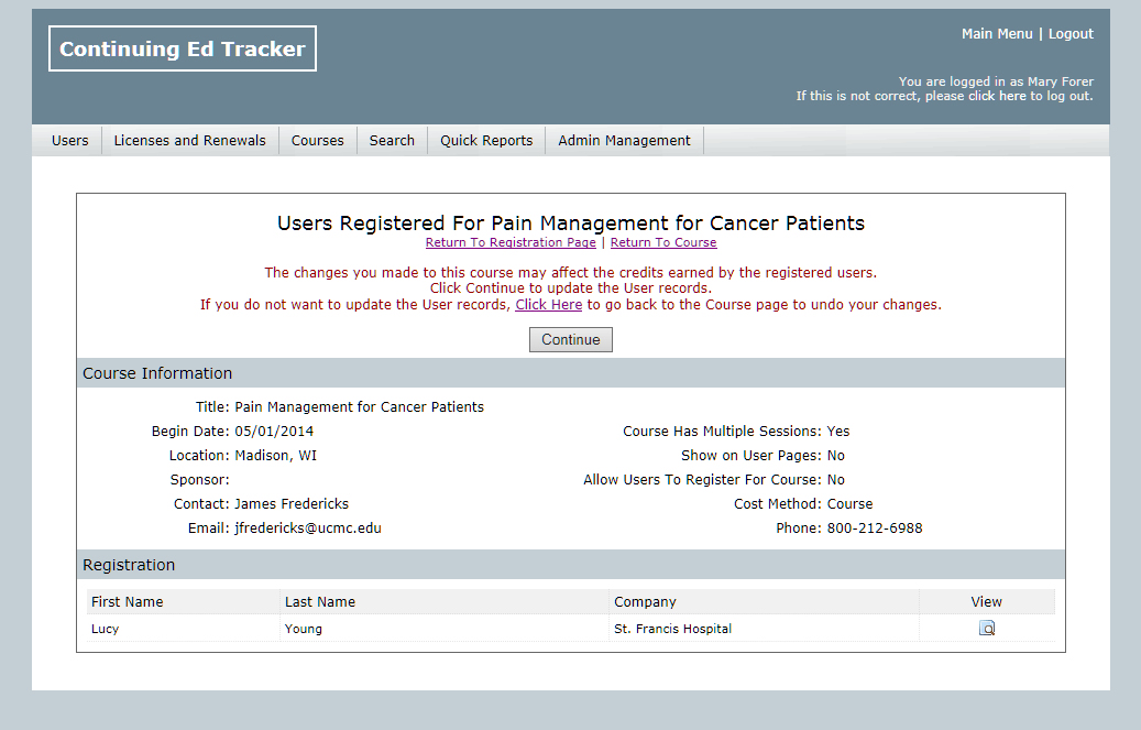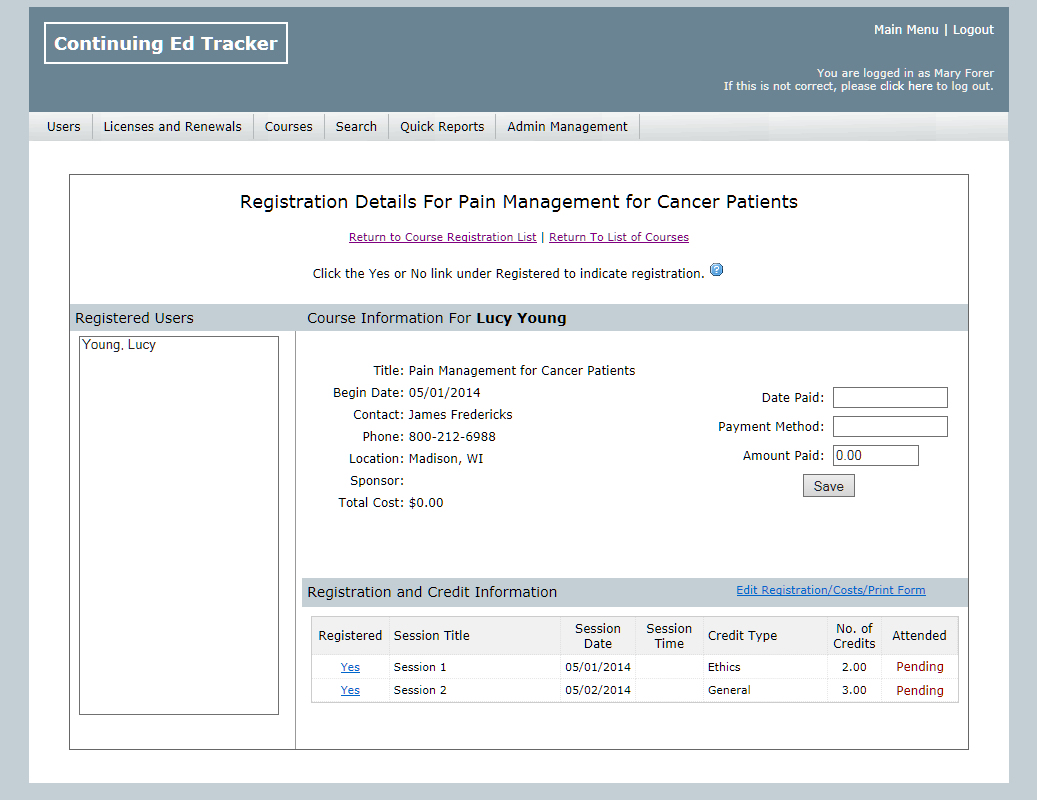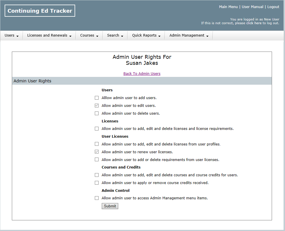 Links to the various features of Continuing Ed Tracker LIVE are also provided so administrators can quickly perform needed tasks.